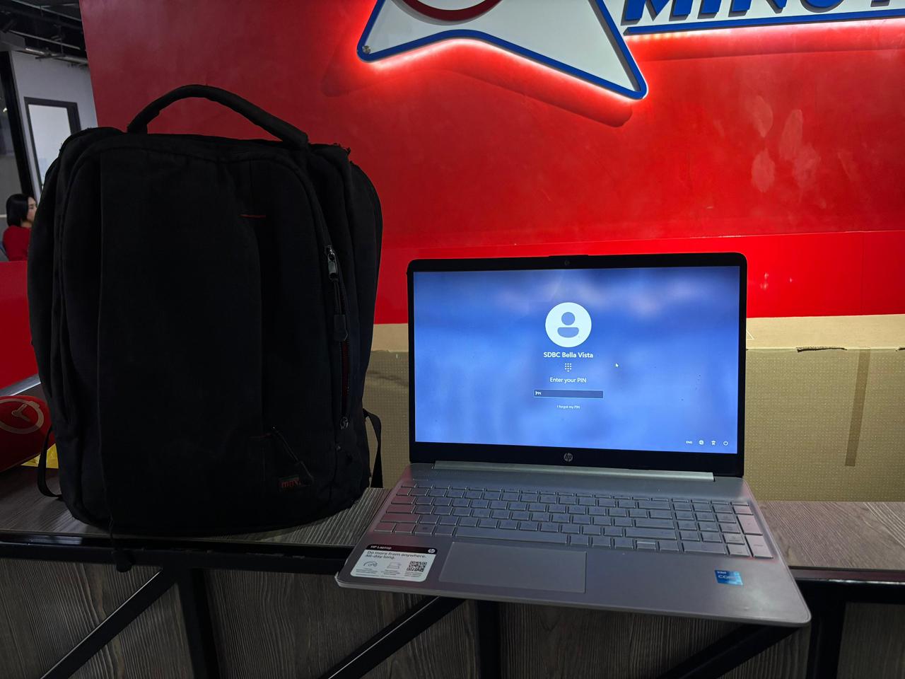 La mochila, de color gris oscuro con detalles rojos, contiene en su interior una laptop marca HP, la cual al ser desbloqueada muestra como usuario el nombre SDBC Bella Vista, además de varios objetos personales, entre ellos cargadores, facturas, portamemorias y memorias externas.