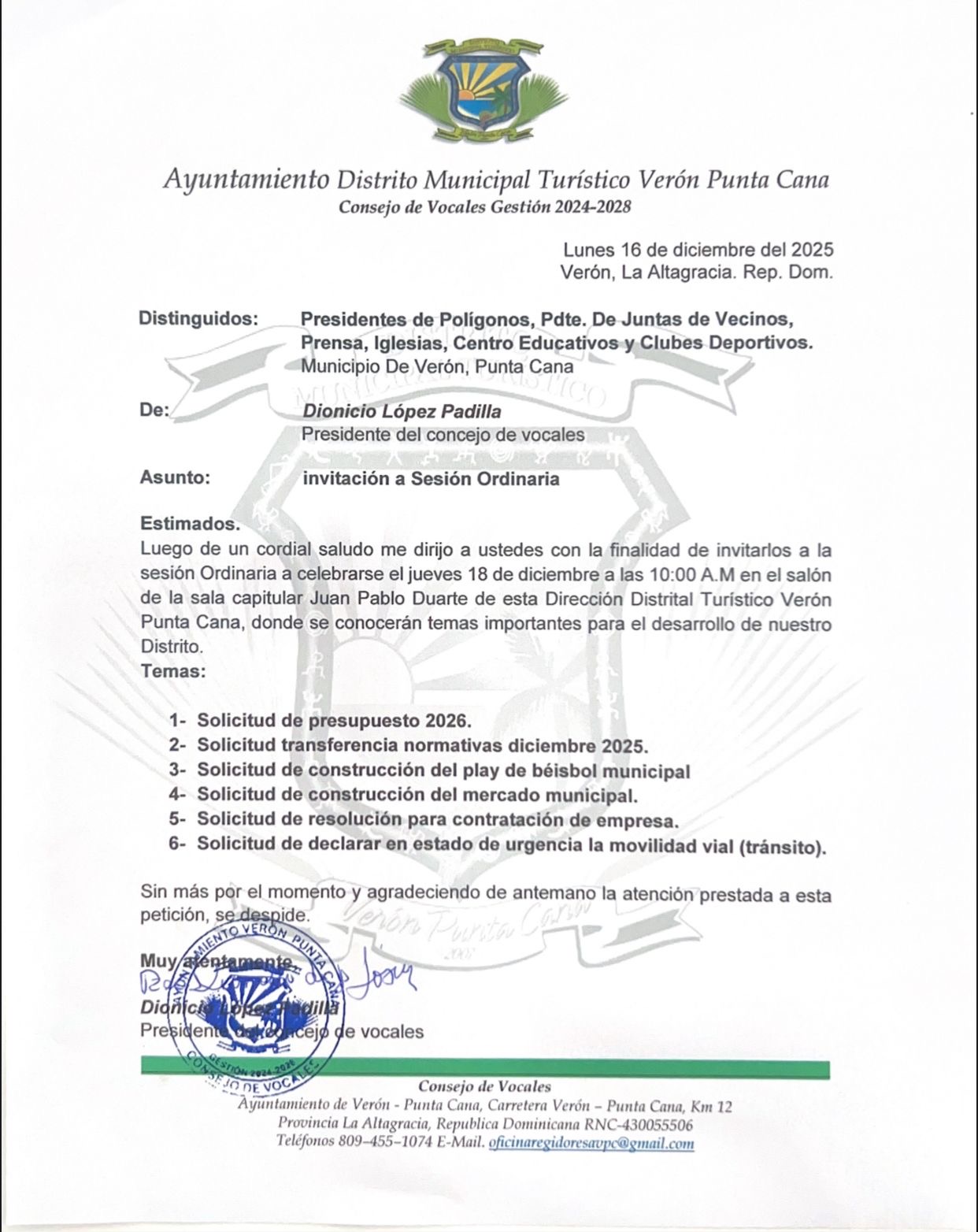 Verón Punta Cana. — El Ayuntamiento del Distrito Municipal Turístico Verón Punta Cana invitó a los miembros del Consejo de Vocales y a la comunidad a participar en la sesión ordinaria pautada para este jueves 18 de diciembre de 2025, a las 10:00 de la mañana, en la Sala Capitular Juan Pablo Duarte.