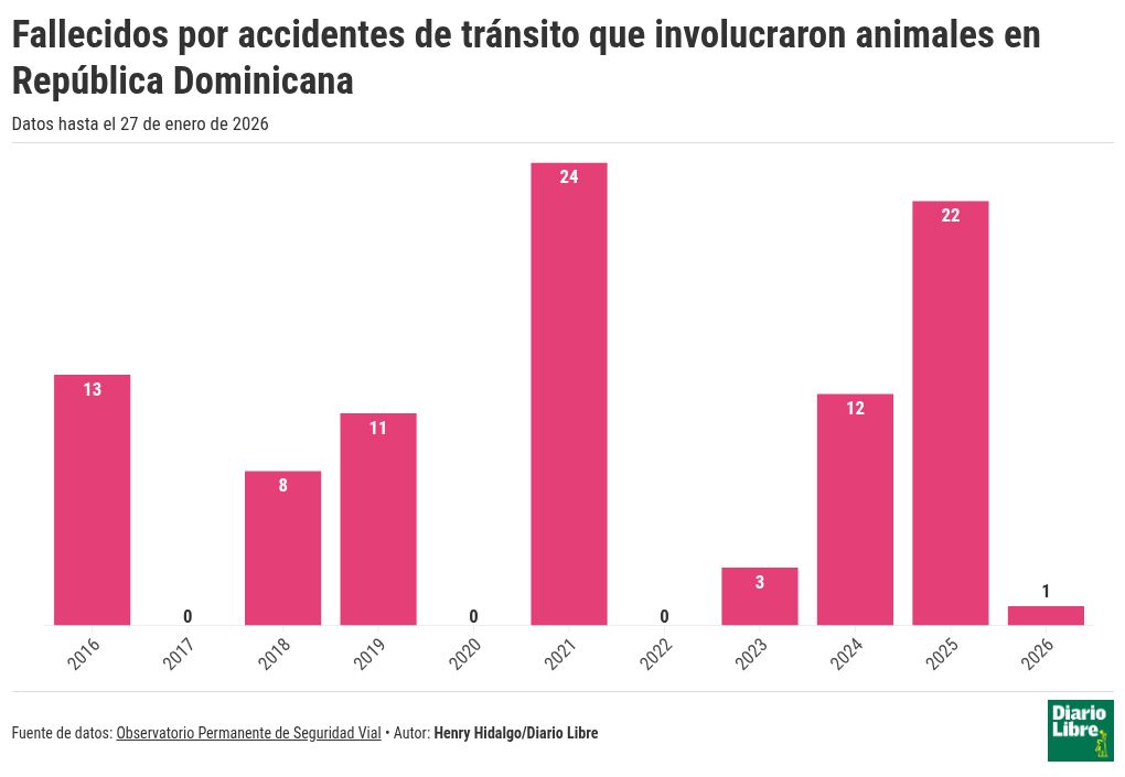 La Ley 63-17 de Movilidad y Tránsito establece que el propietario de un animal es responsable de que este no deambule por la vía pública. De hecho, se impusieron 197 multas entre el 2019 y el 2025 conforme a la ley. Sin embargo, conductores y peatones continúan expuestos a un riesgo que, en la mayoría de los casos, pudo evitarse.